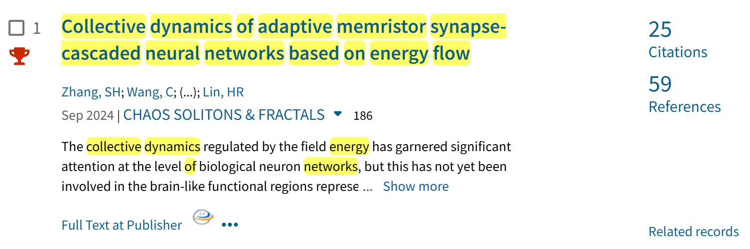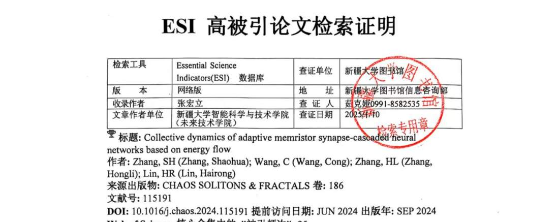 近日,科睿唯安(larivate Analvtics)公布的Essential Science Indicators(简称ESI)数据库最新统计结果,懂球体育张宏立教授团队在非线性动力学领域权威期刊Chaos, Solitons & Fractals(中科院一区,IF=5.3)上发表的文章“Collective dynamics of adaptive memristor synapse-cascaded neural networks based on energy flow”入选ESI全球TOP1%高被引论文。这表明团队在忆阻神经系统动力学方面的研究成果受到了国内外同行的广泛关注。这篇论文第一作者是张宏立教授的博士研究生张绍华同学。